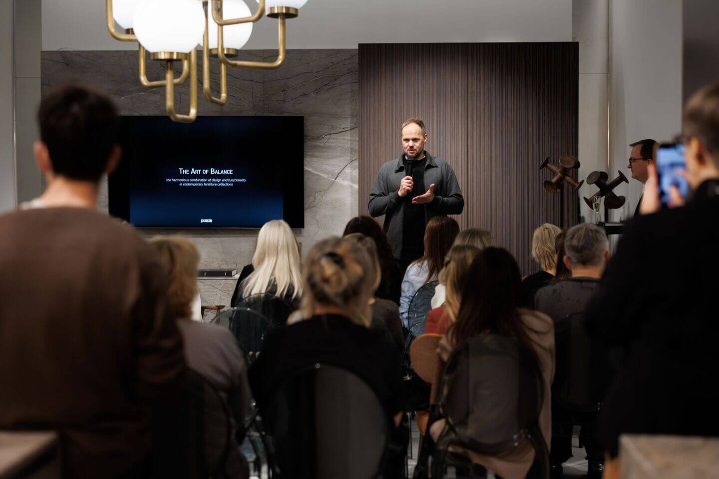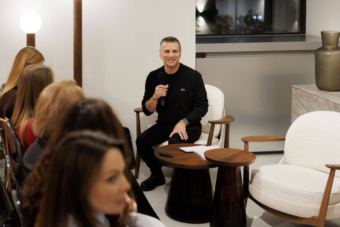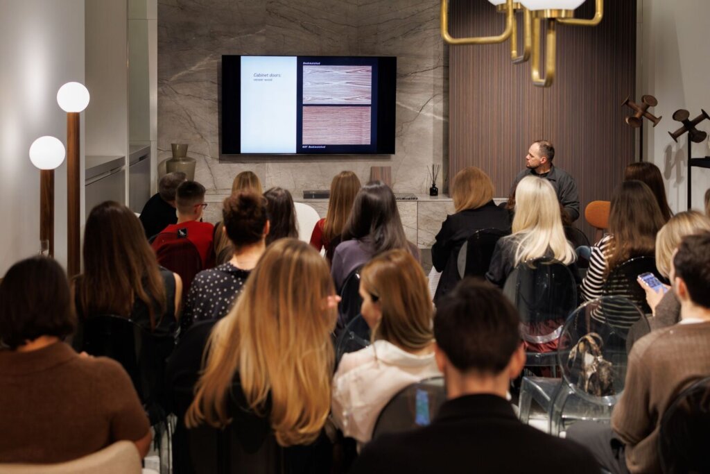 Гость мероприятия, итальянский Дизайнер Карло Баллабио, рассказал о своей роли в жизни бренда и поделился опытом создания мебели Porada. Модерировал встречу редакционный директор INTERIOR + DESIGN Алексей Дорожкин.