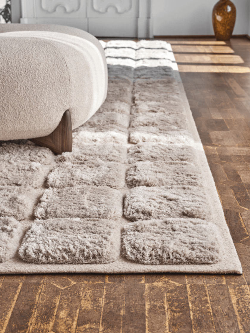 Ковер Goban от Porada — сочетание новозеландской шерсти и натурального волокна Tencel Lyocell. Мягкий и приятный на ощупь, ковер Goban в цвете warm white отличается геометрическим узором в виде шахматной доски: 12 мм сетчатая основа формирует квадраты высотой 45 мм, создавая выразительную текстуру и глубину. Шерсть покрыта натуральным ланолиновым слоем, который защищает от воды и пятен, а Tencel Lyocell — антибактериальное волокно из эвкалипта с шелковистым блеском, добавляющее ковру лёгкую сияющую поверхность. Идеален для гостиной или зоны отдыха.