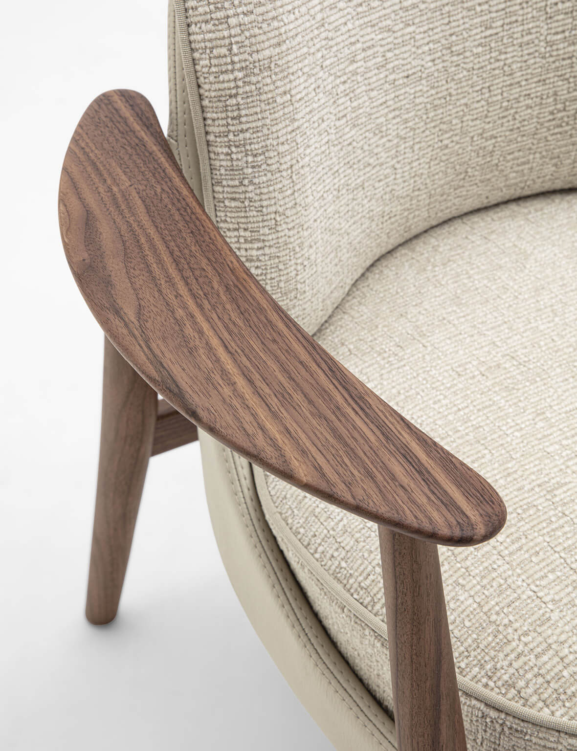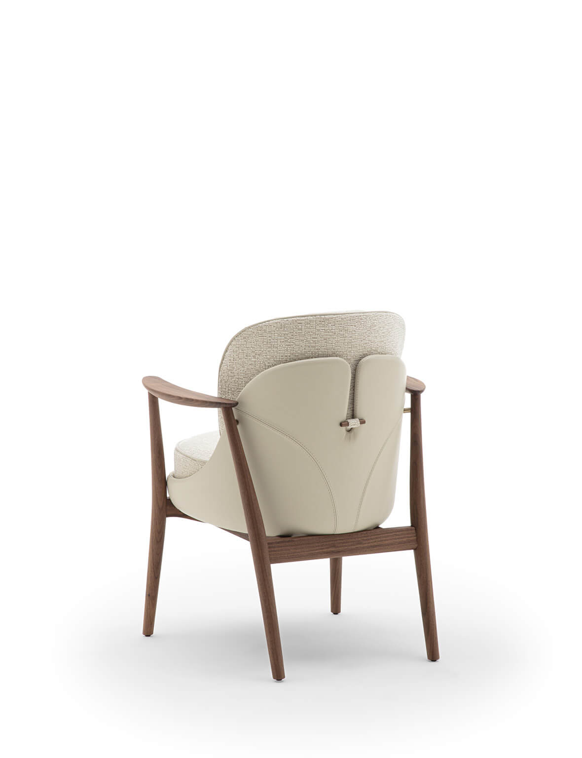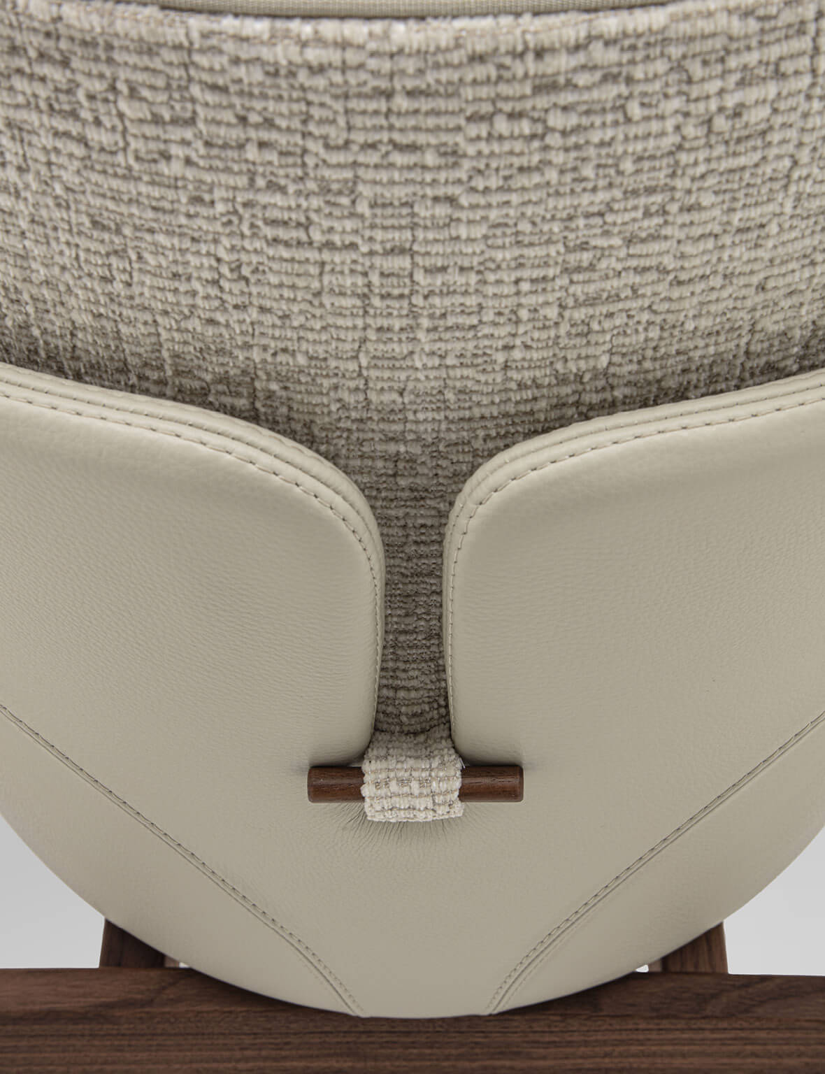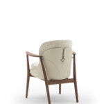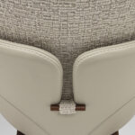 Каркас изготовлен из массива ореха canaletta, внешняя оболочка обтянута кожей. Сиденье и спинка имеют съёмные чехлы из тканей коллекции, что упрощает уход и позволяет варьировать внешний вид. Наполнение сиденья выполнено из материалов разной плотности для комфортной посадки, спинка сформирована из полиуретана. Декоративный кант может быть выполнен в тон или в контрастных оттенках коллекции Zenith, подчёркивая индивидуальность модели. Завершает образ фирменная деревянная деталь на спинке, повторяющая отделку конструкции.