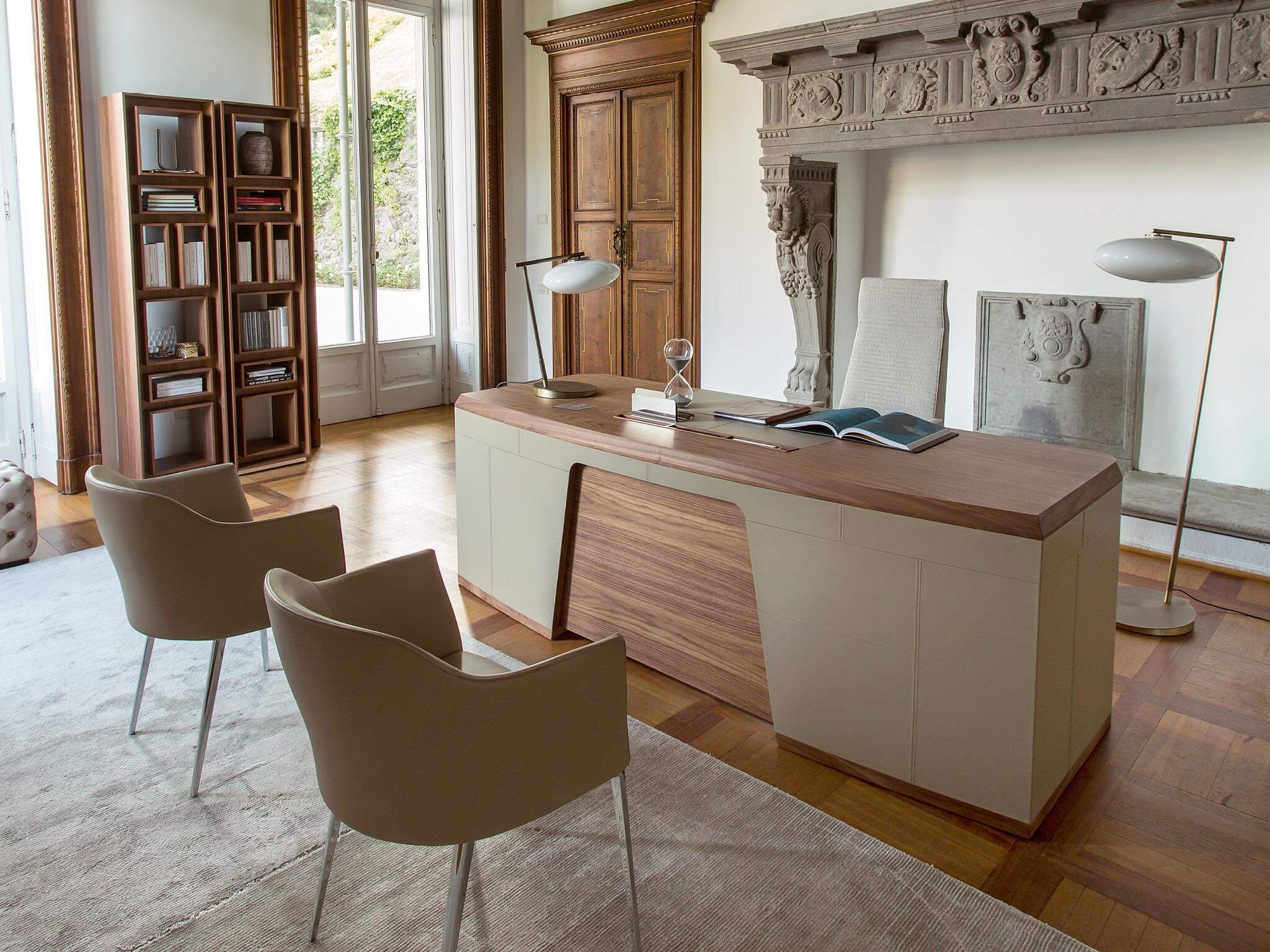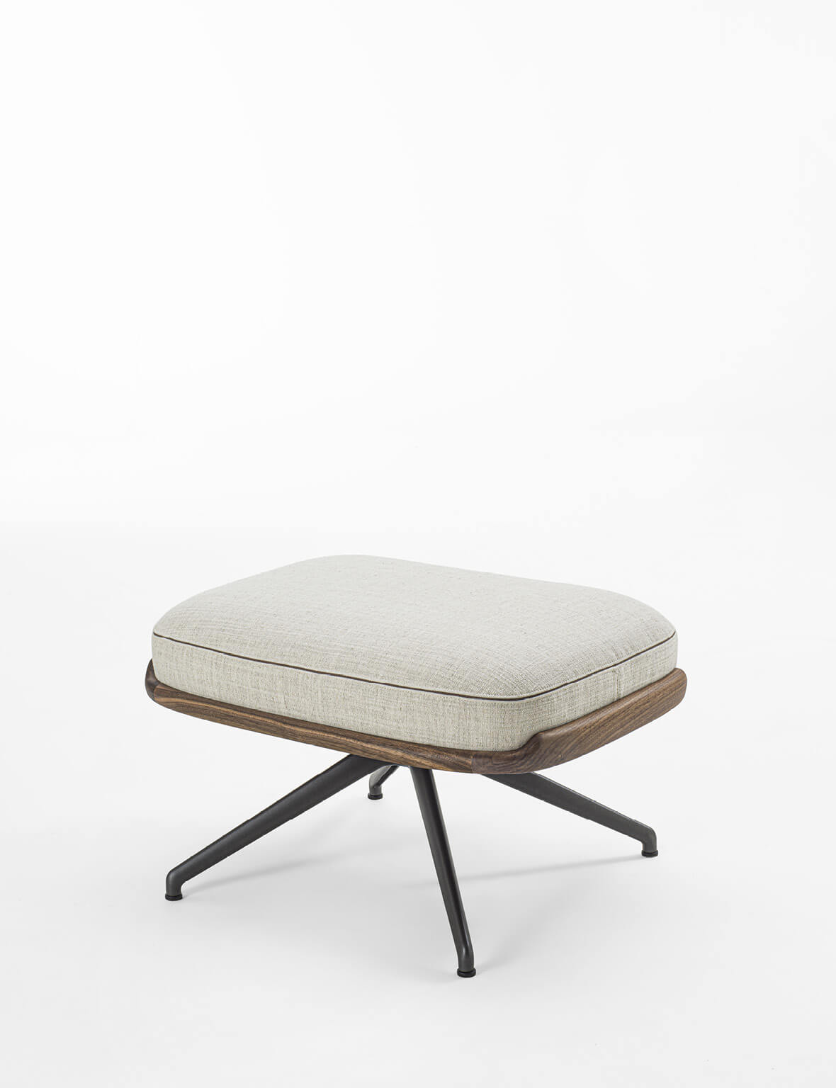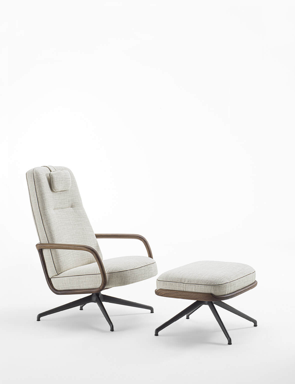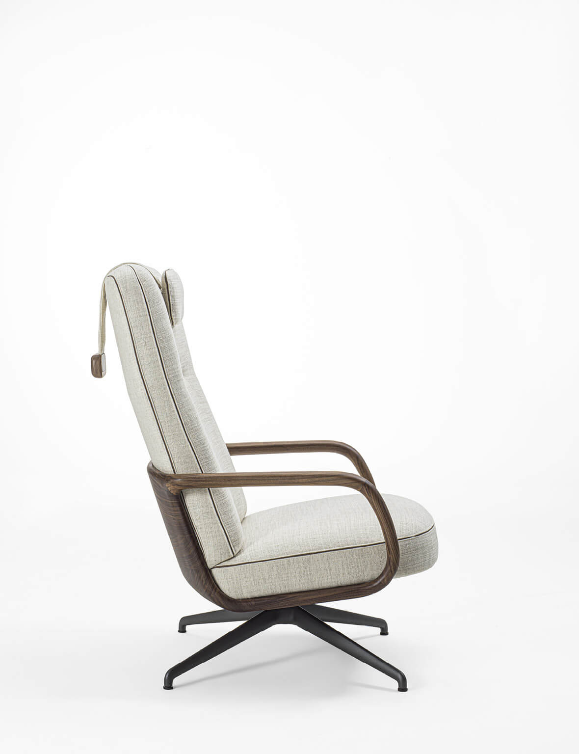 Внутренняя конструкция сиденья и спинки выполнена из фанеры, обивка доступна в тканях коллекции с аккуратным утопленным кантом между швами. Внешняя оболочка из массива ореха canaletta с интегрированными подлокотниками подчёркивает характерный стиль бренда. Съёмный подголовник с противовесом из массива дерева обеспечивает дополнительный комфорт и поддерживает эргономику. Модель может быть дополнена пуфом Cuna Lounge, выполненным в той же стилистике.