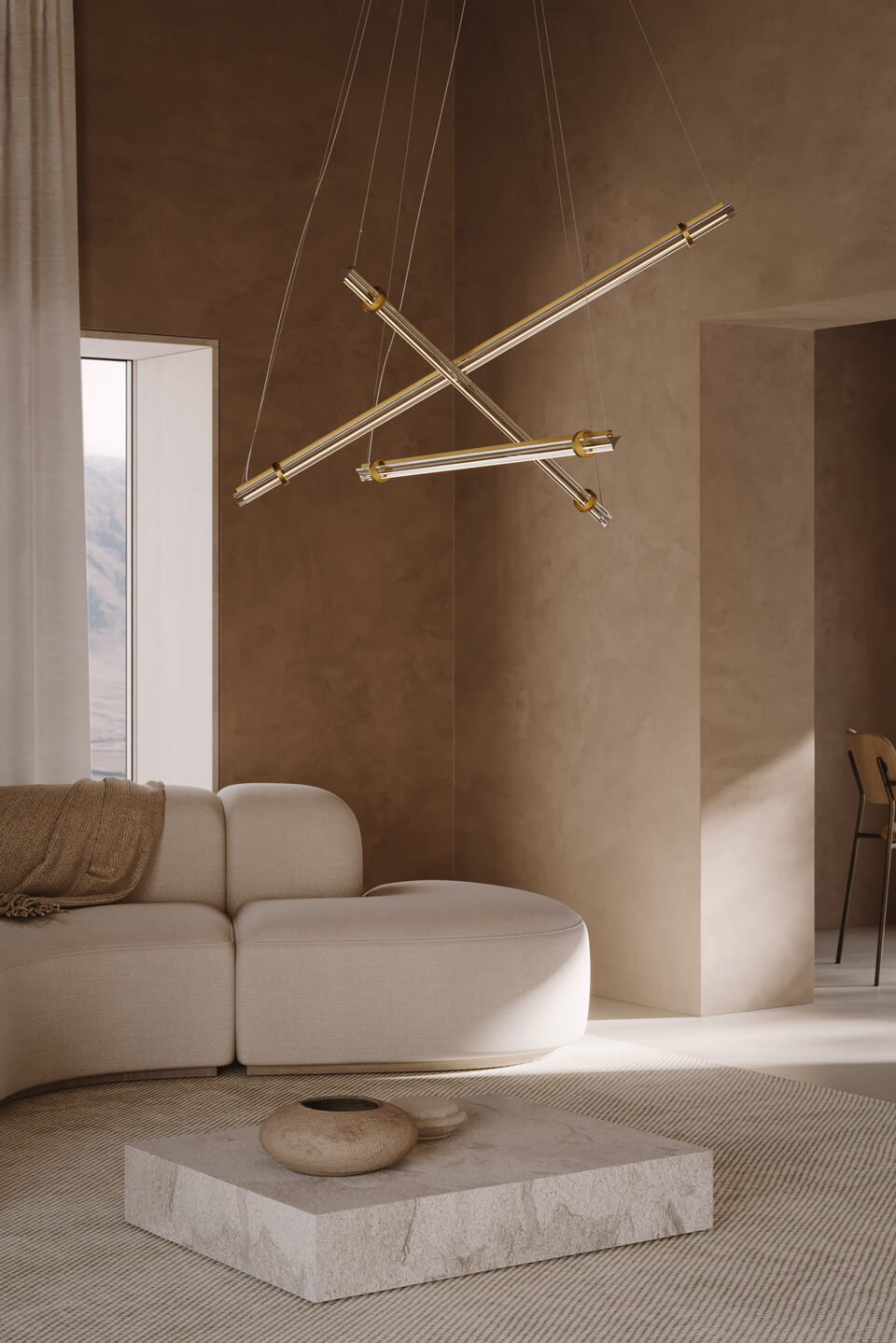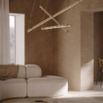 Подвесной светильник Optical 3 от Venicem — выразительная дизайнерская модель с лёгкой геометричной композицией. Конструкция из металла в отделке natural burnished brass дополнена тремя стеклянными элементами в оттенке smoke grey, создающими эффект парящей формы и мягкую игру света. Стеклянные диффузоры обеспечивают комфортное рассеянное освещение и подчёркивают современный характер модели.