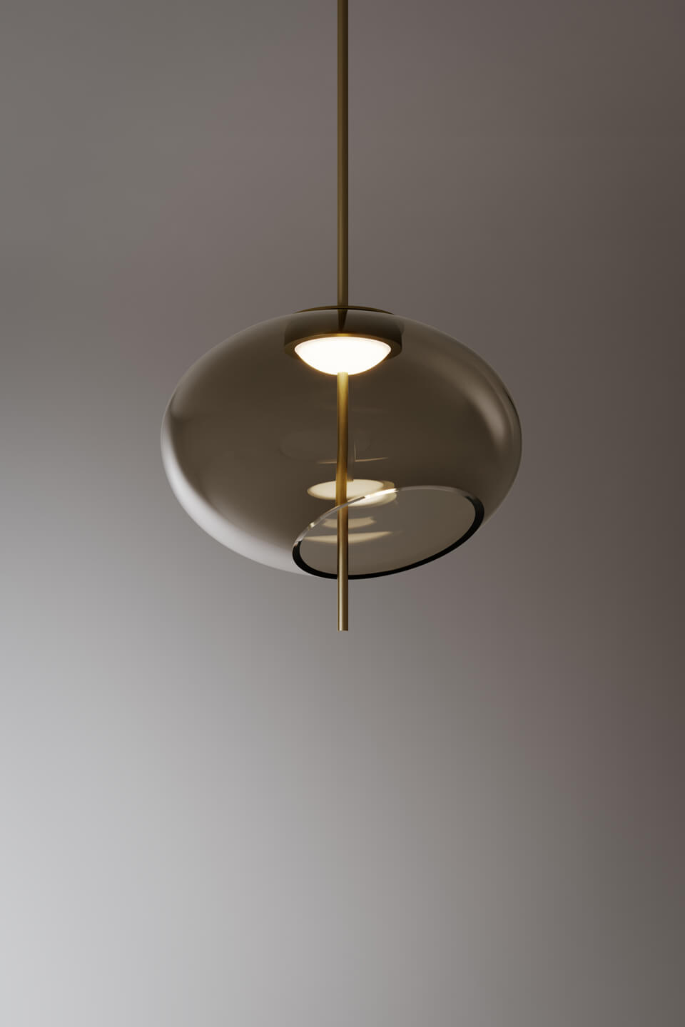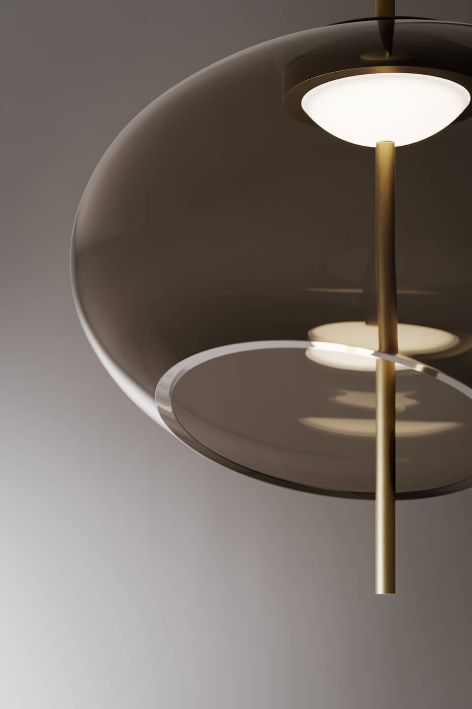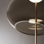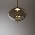 Подвесной светильник Trou от Venicem, разработанный дизайнером Массимо Тонетто, отличается выразительной художественной формой и лёгким визуальным эффектом. Композиция построена на асимметрично срезанных шарах из выдувного стекла в оттенке dove grey, создающих игру света и тени и ощущение парящих элементов. Металлическая структура в отделке dark burnished brass подчёркивает благородный характер модели и поддерживает стеклянные диффузоры.