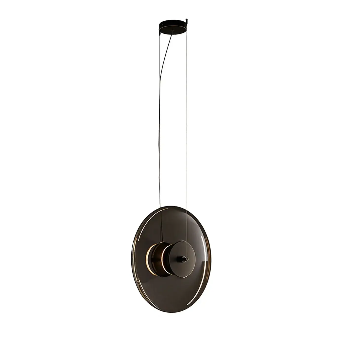 Подвесные светильники Zen от Venicem сочетает выразительную геометрию и лёгкость стекла, создавая эффект парящих световых дисков. Диффузор выполнен из муранского стекла в оттенке smoke grey, а структура из металла в отделке dark burnished brass подчёркивает глубину формы и благородный характер модели. Коллекция включает три размера, которые можно использовать как по отдельности, так и объединять в эффектные композиции, создавая динамичные световые сценарии. Длина кабеля регулируемая.