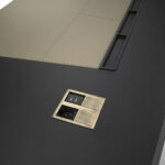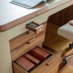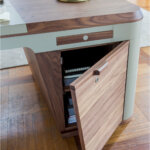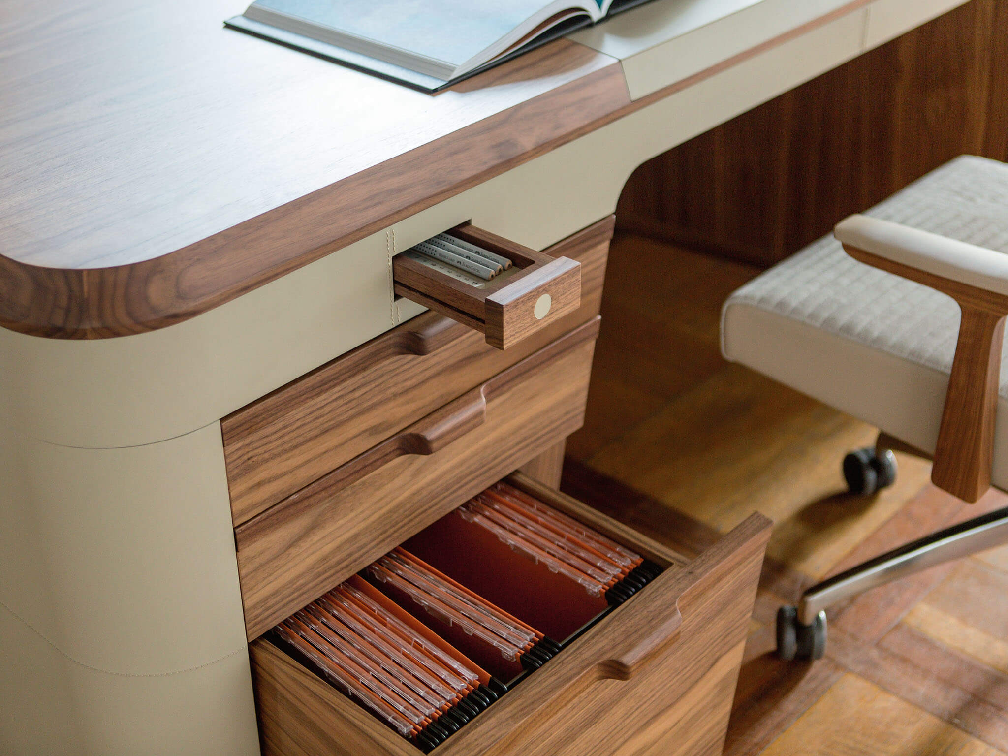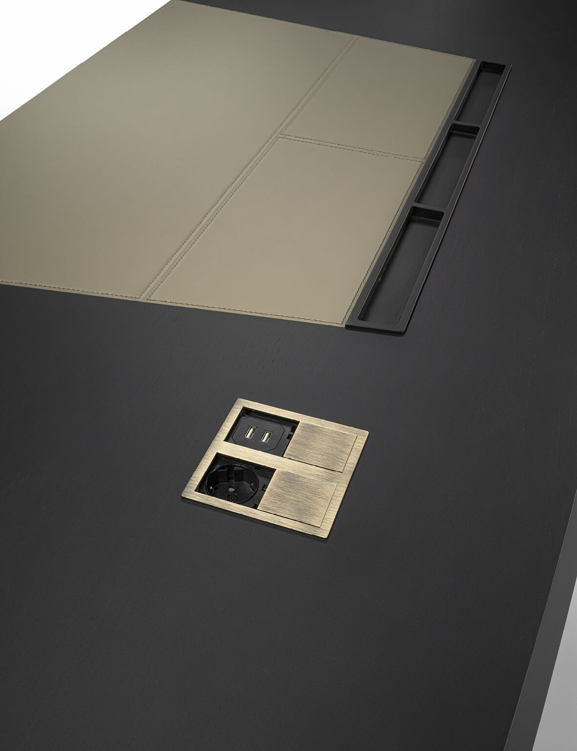 Внешняя рама отделана кожей Cuoietto, внутренняя часть выполнена из дерева. Столешница дополнена кожаной вставкой Cuoietto с видимой строчкой. В верхней части предусмотрен модуль хранения с отделениями для мелких предметов, а также встроенные розетки Schuko и выдвижные USB-порты.