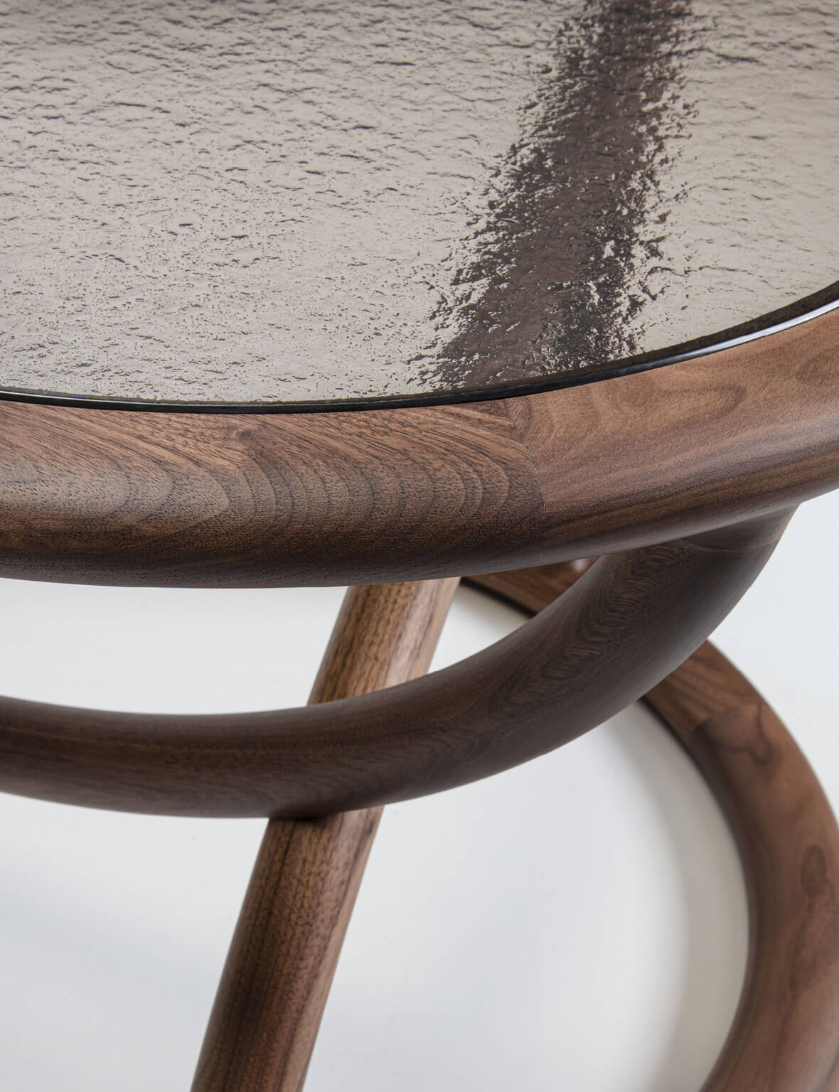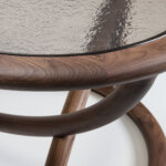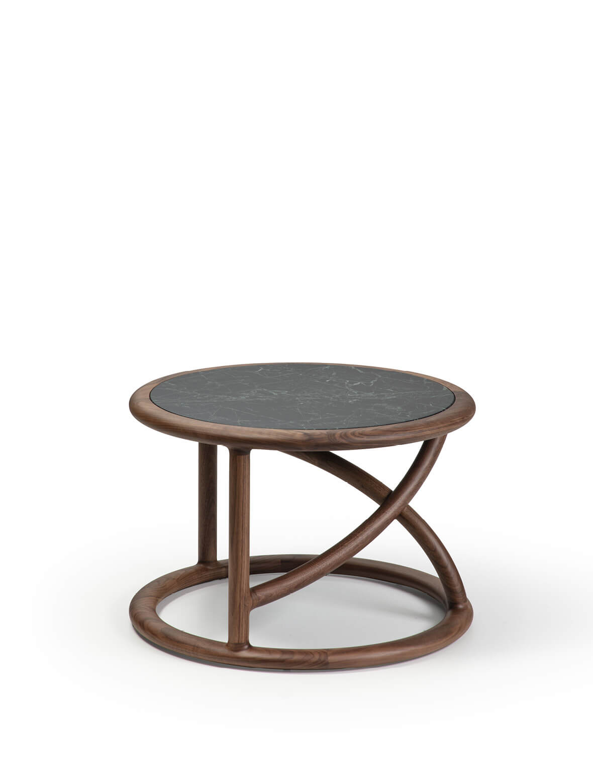 Приставные столики Flip от Porada, дизайн Алессандро Радице — коллекция журнальных и боковых столиков с выразительной скульптурной конструкцией. Основание выполнено из массива ореха canaletta с характерной «скрученной» формой, создающей динамичный и графичный силуэт.