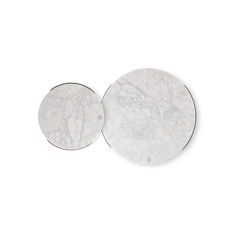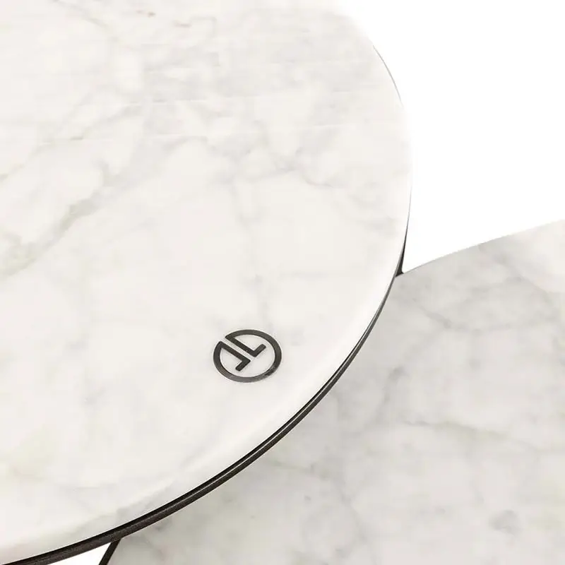 Журнальные столики Gala от Luxence представляют собой современную интерпретацию эстетики круглых столиков 1950-х годов. Доступные в двух размерах, они отличаются плавными формами металлического основания в бронзовом оттенке, которое контрастирует с белой мраморной поверхностью, создавая интересную игру контрастов.