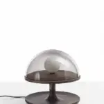 Доступна в версии с куполом из прозрачного дымчатого стекла и основанием из ореха Canaletta. Диаметр светильника 40 см, высота 38 см.