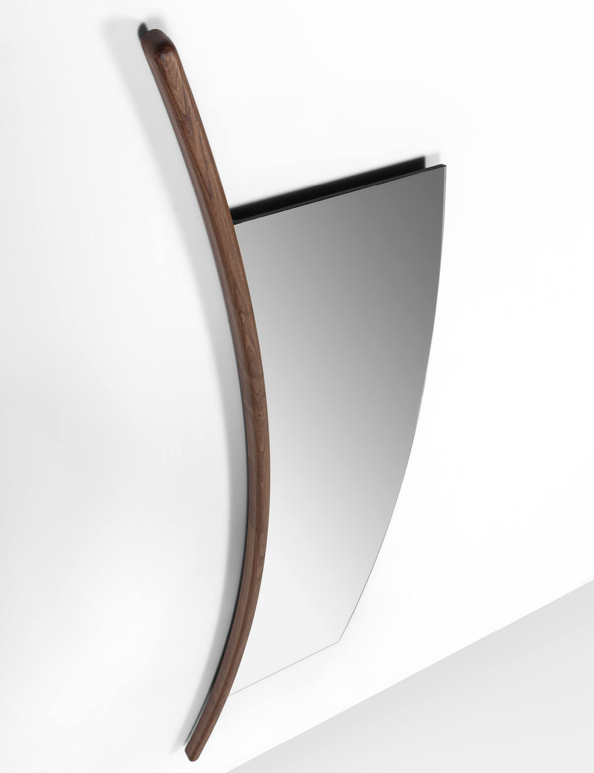 Зеркало Katana от Porada, дизайн Джино Вигано — настенное зеркало с минималистичной эстетикой и чистыми линиями, сочетающее функциональность и декоративный характер.